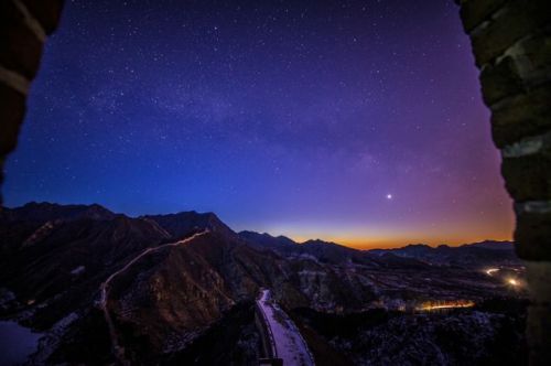 這是在北京懷柔黃花城長城一座烽火臺上拍攝的日出前的星空。新華社記者楊光 攝