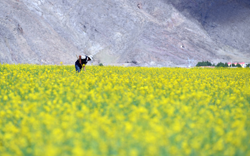 7月2日,拉薩市堆龍德慶區(qū)德慶鄉(xiāng)的村民在打理油菜花田。